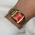 The square Gracieuse Petite watch for women features a 24 mm gold coloured case, a watermelon red sunray dial and a gold coloured stainless steel 14 mm strap.